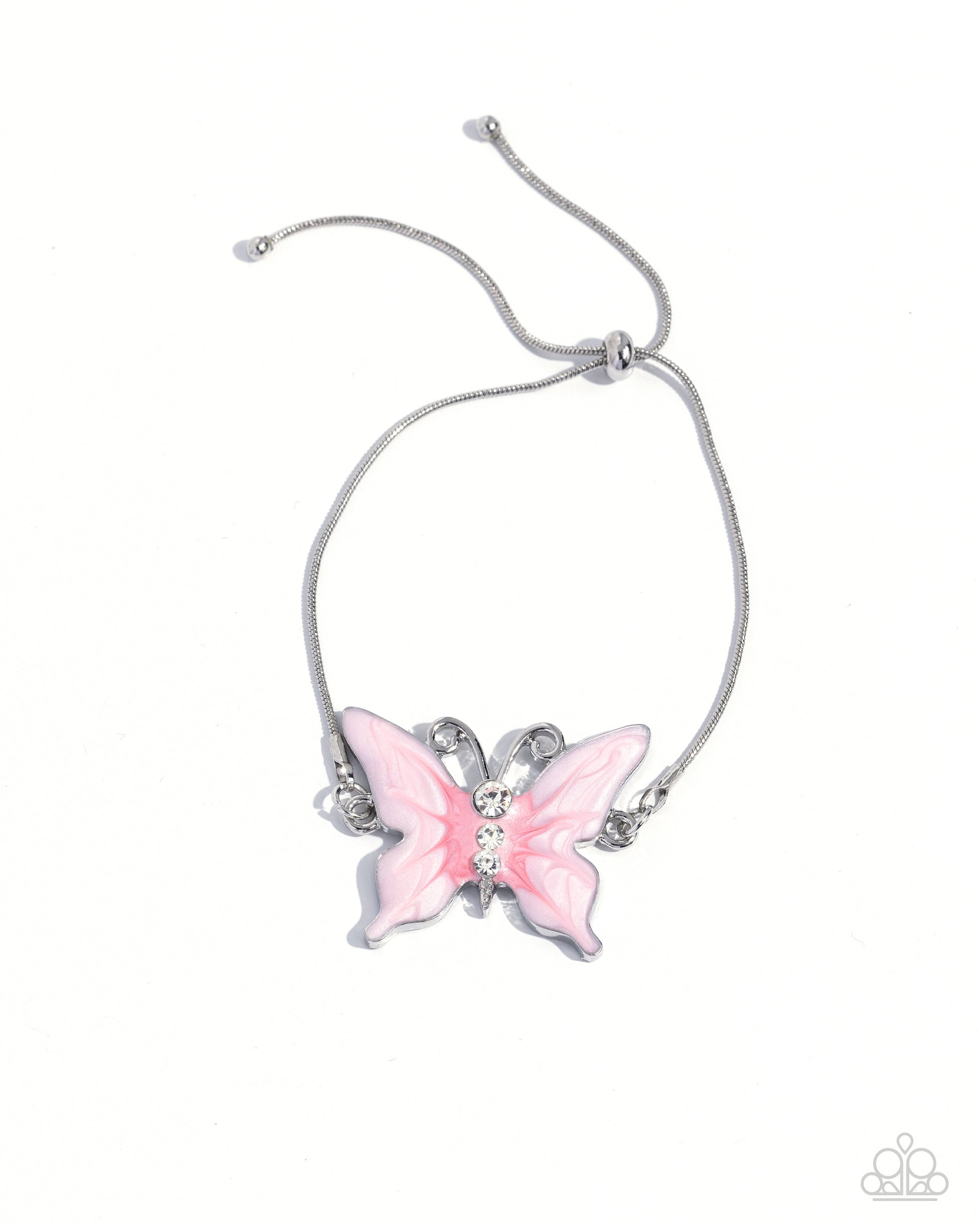 Featuring a glossy finish, an asymmetrical pink-painted butterfly patterned with accents of darker pink whimsically dances along a dainty silver snake chain. Three white gems decrease in size along the butterfly's body for a radiant finish around the wrist. Features an adjustable sliding knot closure.