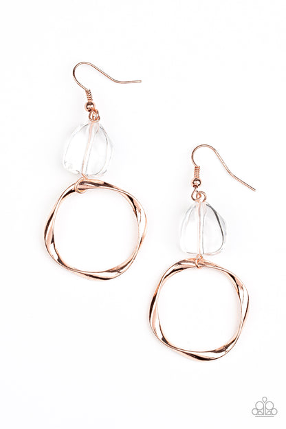 An imperfect crystal-like gem gives way to a twisted shiny copper hoop, resulting in a refined asymmetrical display. Earring attaches to a standard fishhook fitting.