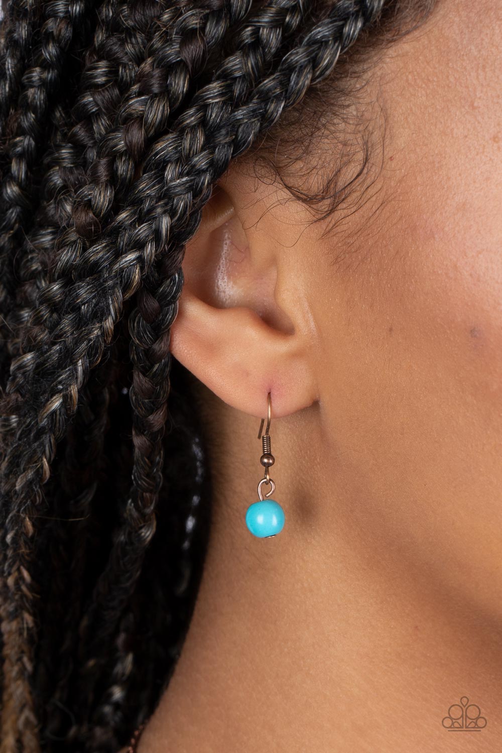 Accented in oval turquoise stones, a decorative copper butterfly flutters at the bottom of a copper chain for a free-spirited finish. Features an adjustable clasp closure.