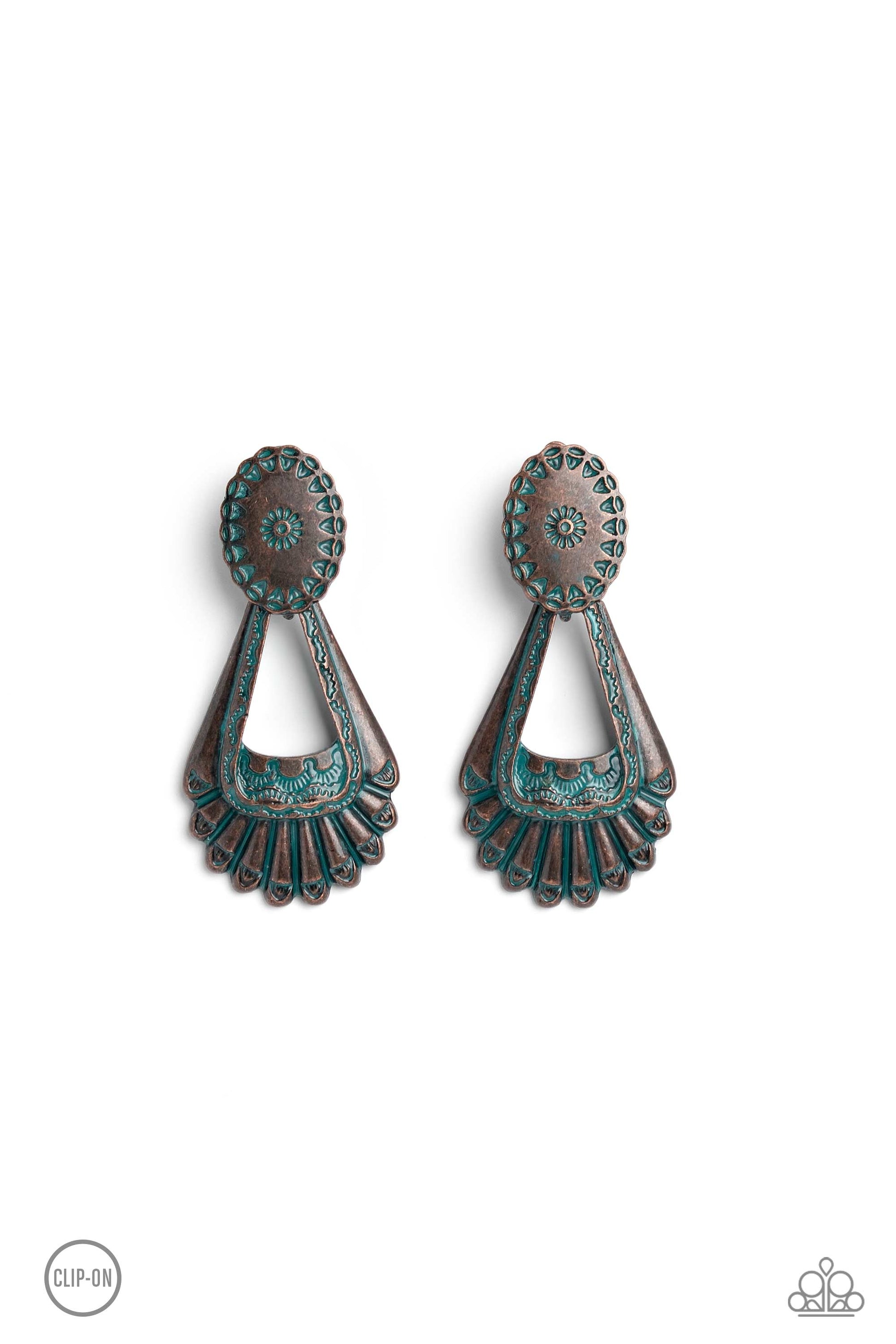 Dangling from a Southwestern-patterned post, a rustic, brass patina frame swings for some aged authenticity below the ear. Feathered details stream from the lower frame for additional artisanal detail. Earring attaches to a standard clip-on fitting.