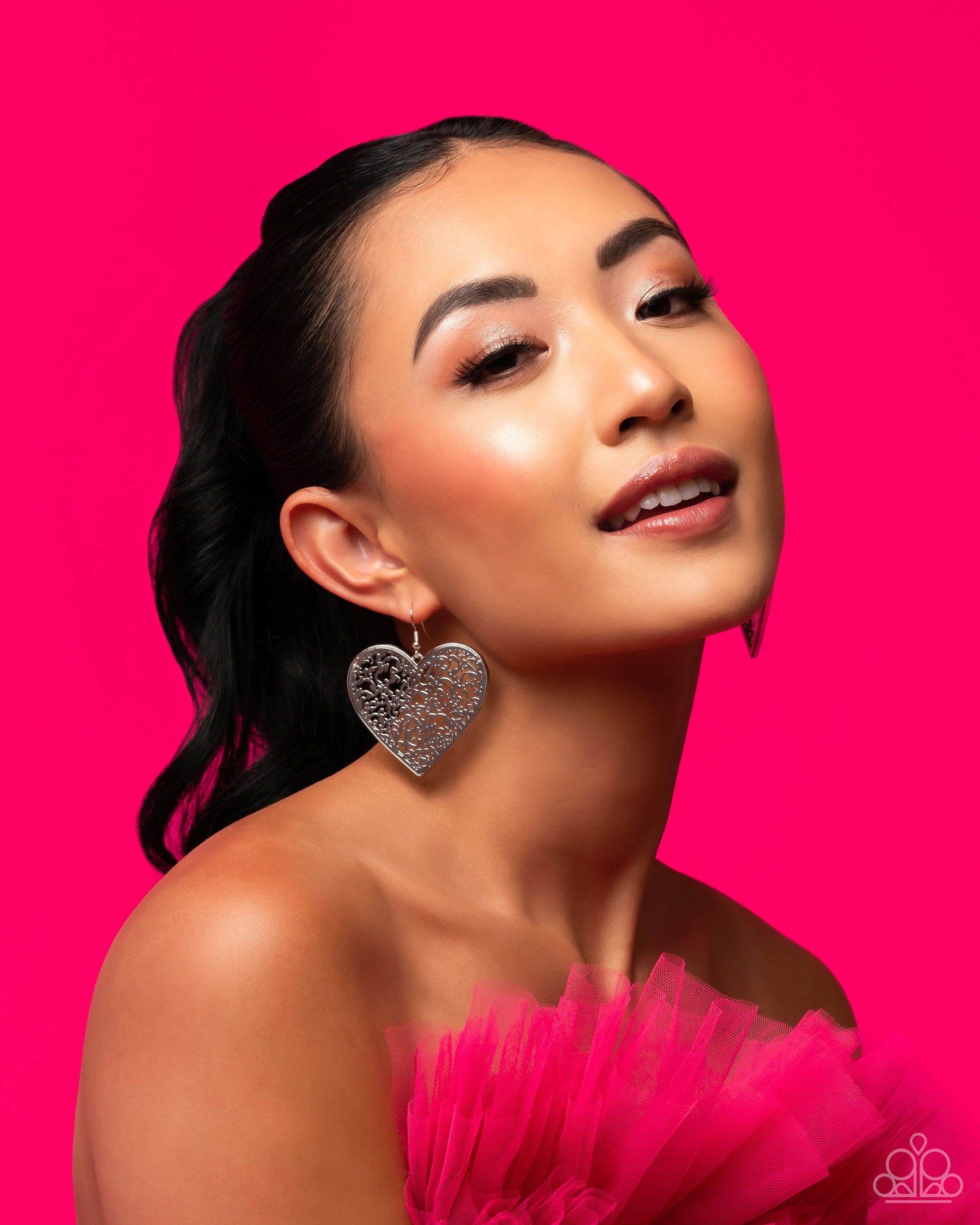 shiny, oversized silver heart is filled with swirls of filigree, emitting vintage whimsy as it swings from the ear. Earring attaches to a standard fishhook fitting.