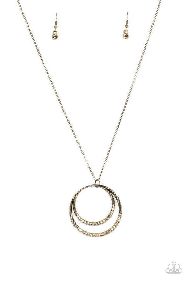 A daring circular pendant swings from the bottom of an elongated brass chain for a refined look. The bottoms of the ornate brass pendant are encrusted in golden topaz rhinestones for a glamorous finish. Features an adjustable clasp closure.