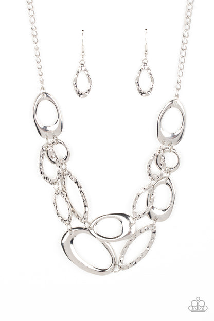 A mismatched assortment of asymmetrical and hammered silver ovals delicately links below the collar, creating refined metallic layers. Features an adjustable clasp closure.