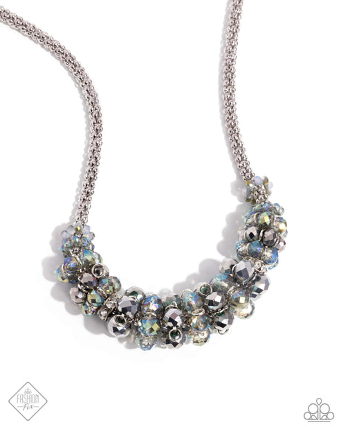 A silver mesh chain gives way to an explosion of silver, faceted silver, UV-splashed, and opalescent beads that circle around the chain below the neckline creating a colorful infinite display. White rhinestone-encrusted silver ornaments are featured along the wreathed design for additional shimmer and texture. Features an adjustable clasp closure. Due to its prismatic palette, color may vary.
