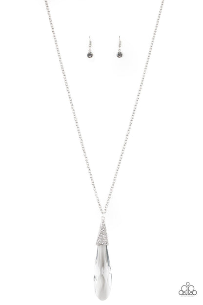 Capped in a silver frame radiating with glittery white rhinestones, a glassy teardrop pendant swings from the bottom of a lengthened silver chain for a jaw-dropping look. Features an adjustable clasp closure.
