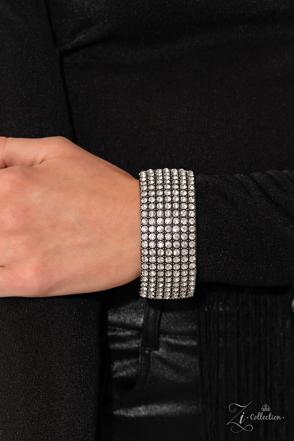 Row after row of glistening, white rhinestones are emblazoned across the surface of a thick silver bangle. Tiny silver studs separate each individual gem, creating the illusion of pronged settings, and infusing the design with some unexpected industrial grit.