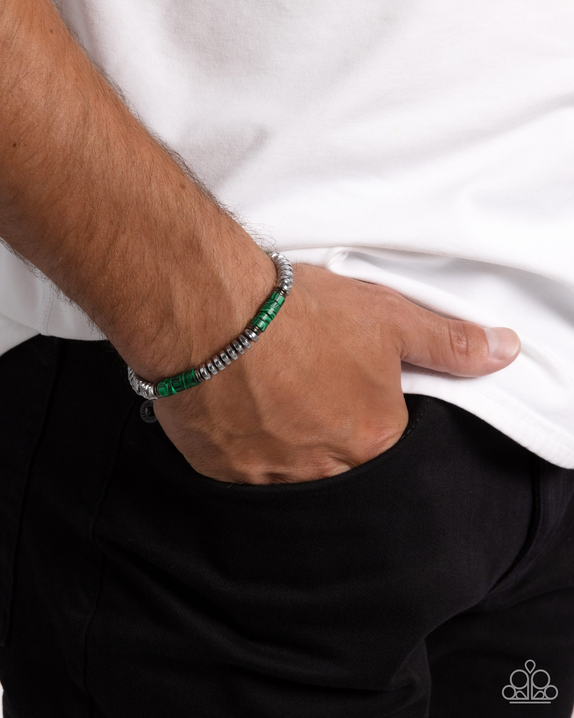 Infused along an elastic stretchy band, a collection of glistening silver discs alternates with sections of green-striped stone discs bordered by duos of glistening gunmetal discs for a marbled medley along the wrist. As the stone elements in this piece are natural, some color variation is normal.