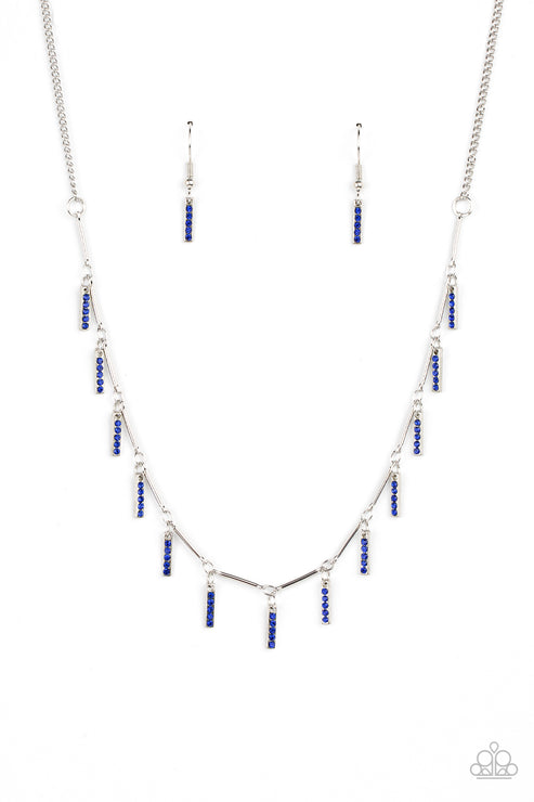 Dotted in stacks of glittery blue rhinestones, dainty silver rectangular frames drip between shiny silver bars along the collar, creating a dainty fringe. Features an adjustable clasp closure.