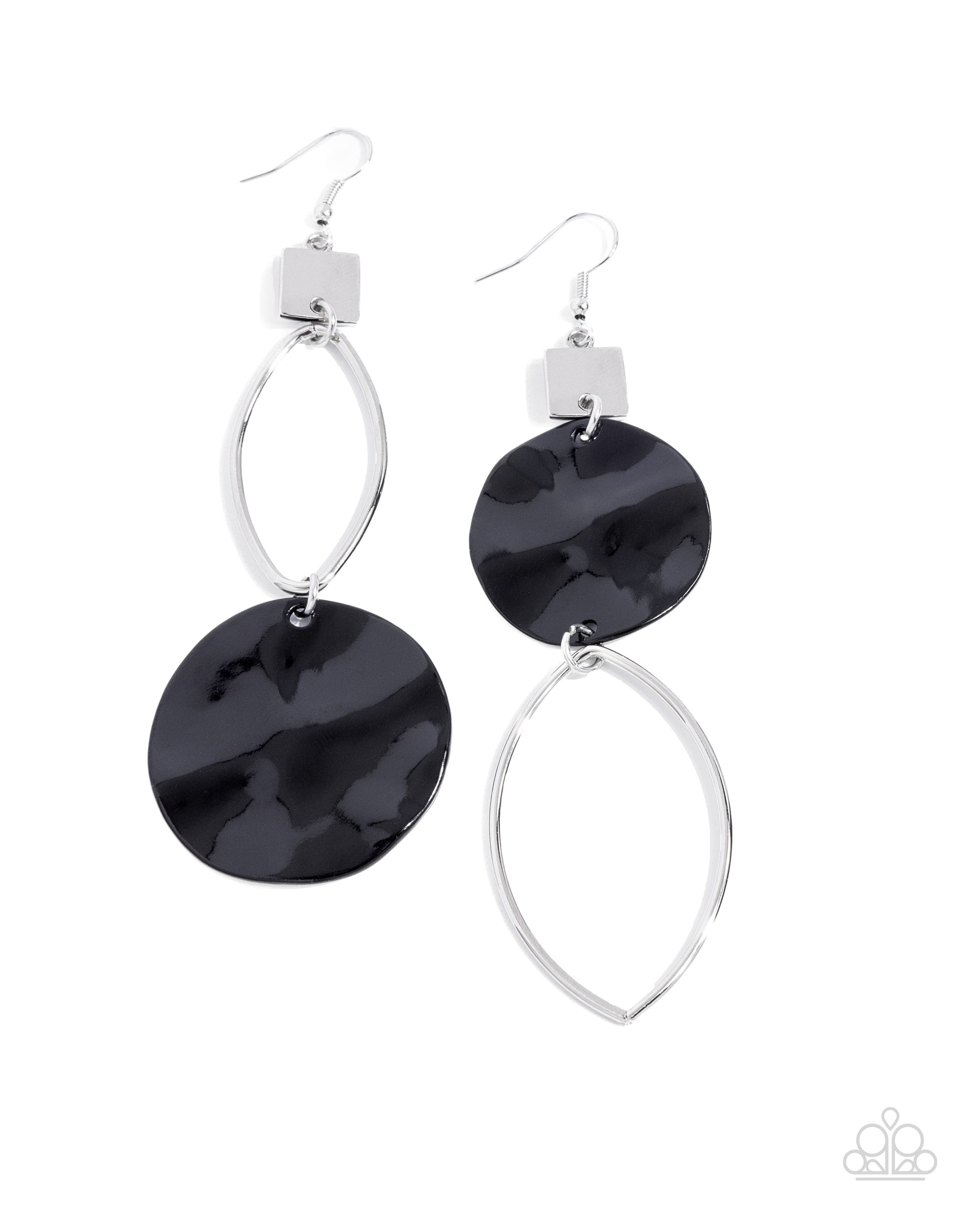 Connected to a solitaire silver square, an elongated silver oval and hammered black-painted oversized disc alternate in pattern between the two ears, dusting the shoulders for an iconic, industrial look. Earring attaches to a standard fishhook fitting.