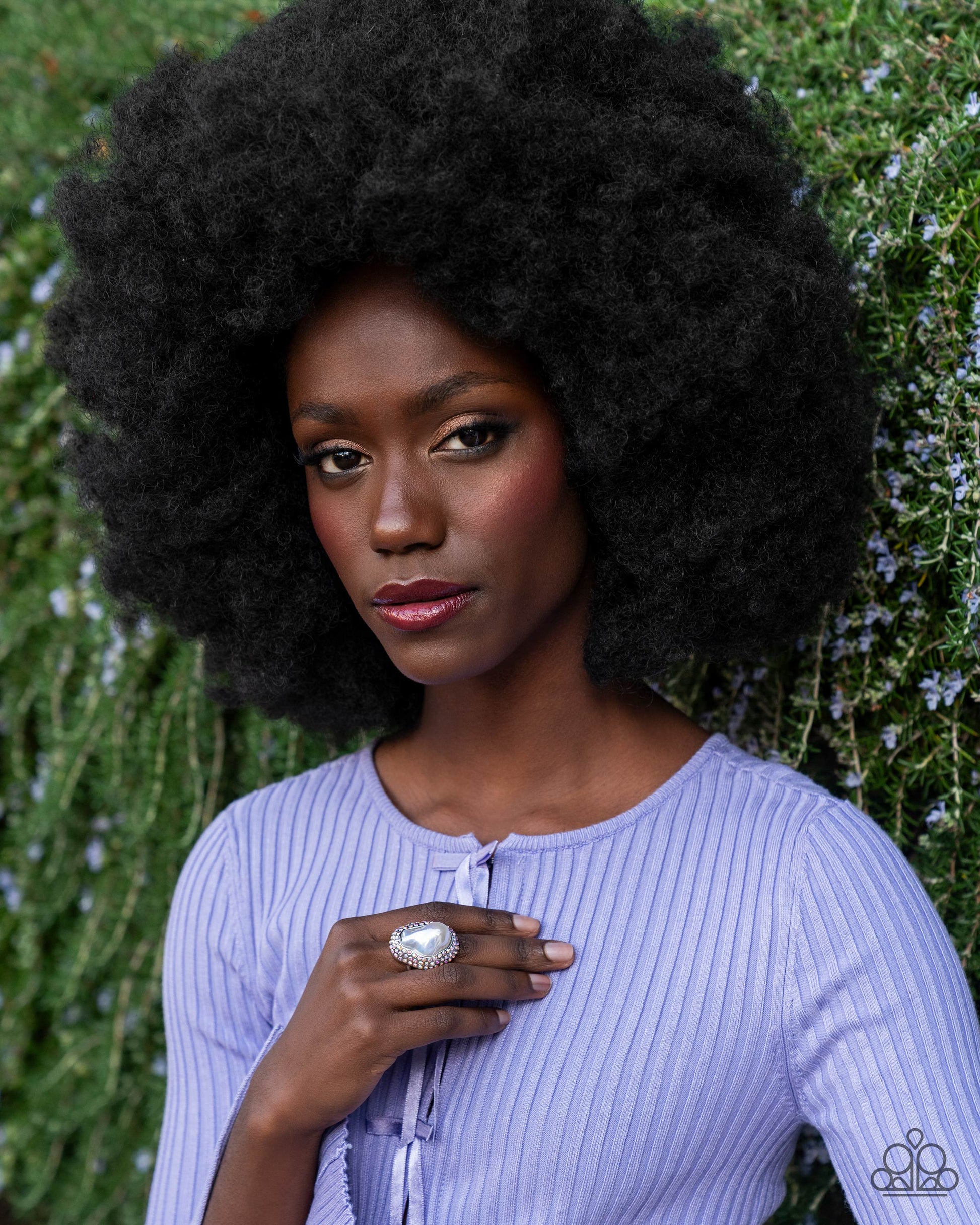 Pressed in a white clay, iridescent-encrusted abstract silver frame, a glossy baroque white pearl glistens atop the finger for a whimsical ocean-inspired design. Features a stretchy band for a flexible fit. Due to its prismatic palette, color may vary.