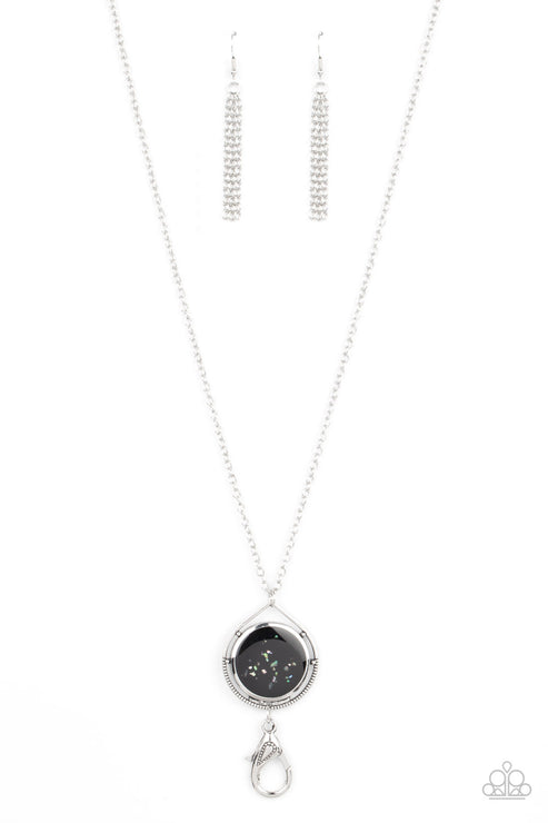 Speckled with flecks of iridescent shell-like accents, a glassy black frame is encased inside an ornate silver teardrop fitting at the bottom of a lengthened silver chain. A lobster clasp hangs from the bottom of the design to allow a name badge or other item to be attached. Features an adjustable clasp closure.