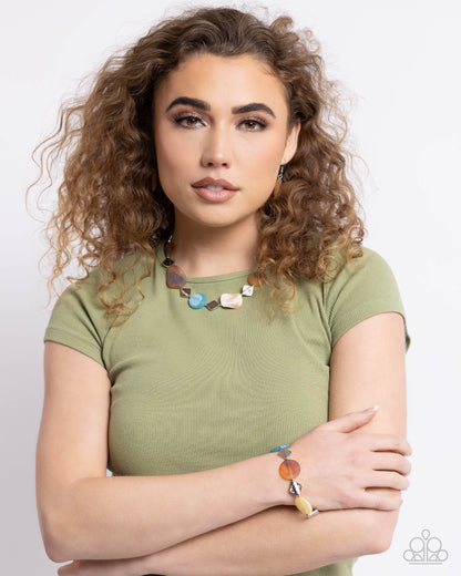 Infused along an elastic stretchy band, a collection of textured diamond silver beads, round silver beads, and clear blue, milky Primrose, brown swirled, and white swirled with brown beads in varying shapes coalesce along the wrist for an artistic, animated look.