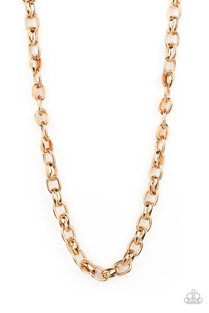 A chunky collection of bold gold links interlock across the chest, creating an intense industrial centerpiece. Features an adjustable clasp closure.