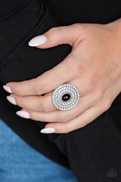 A shiny black bead is pressed into the center of a round silver frame radiating with countless white rhinestones, creating a blinding statement piece. Features a stretchy band for a flexible fit.