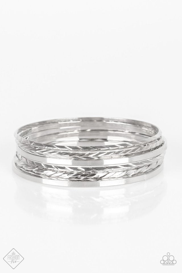 Featuring a collision of smooth and shimmery serrated textures, a group of perfectly mismatched silver bangles stack across the wrist for a sleek industrial vibe.