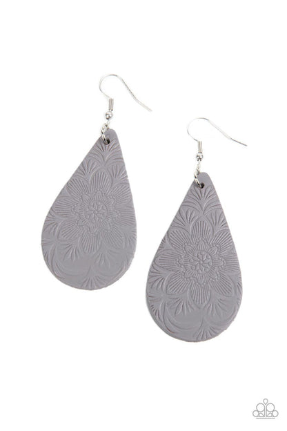 Embossed in a tropical floral pattern, a distressed Ultimate Gray leather teardrop swings from the ear for a whimsically rustic flair. Earring attaches to a standard fishhook fitting. Color may vary.