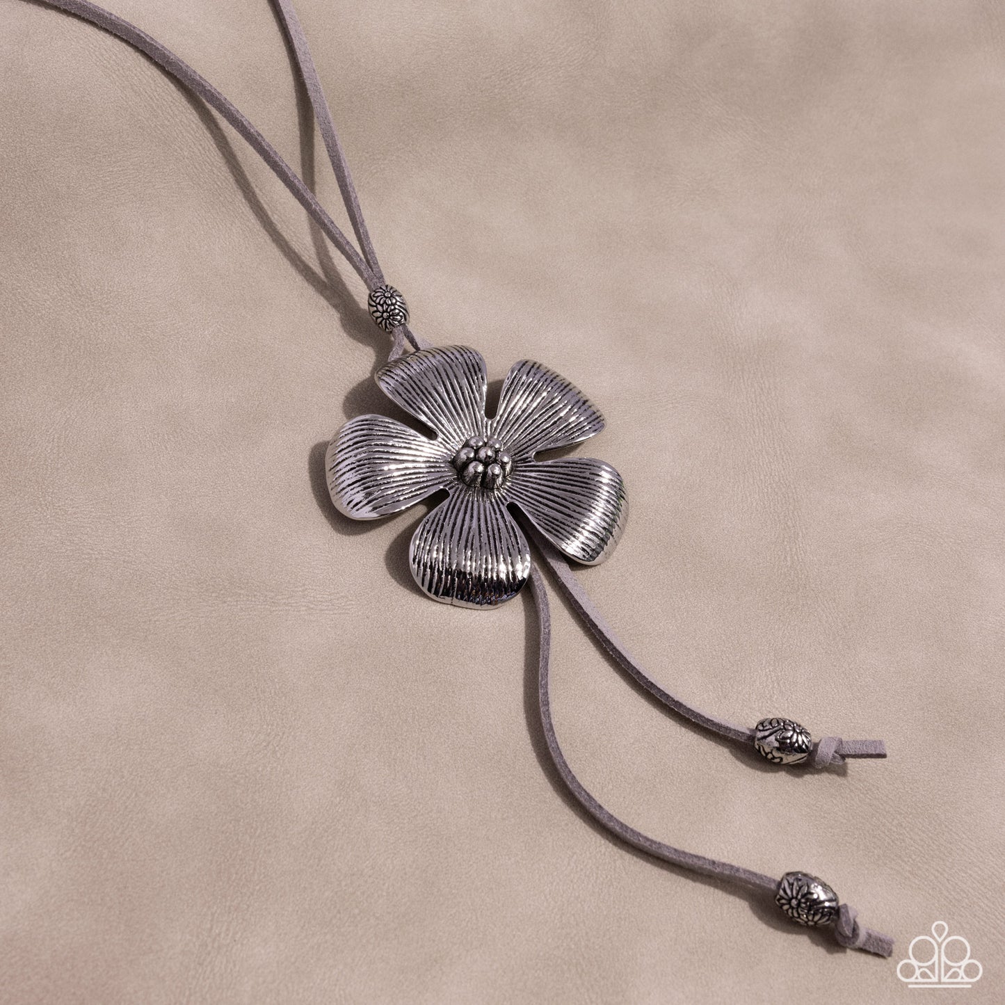 Featuring a mini-beaded floral center, a textured silver flower glides along a gray cord around the neckline creating an adjustable pendant. Highly-embellished silver floral oval beads cap the ends of the gray cording and rise above the solitaire flower for additional whimsy. Features a bolo closure.