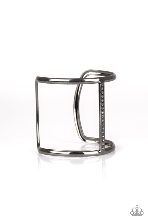 Glassy hematite rhinestones are encrusted down the spine of an airy gunmetal cuff for an edgy look.