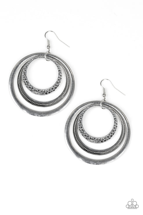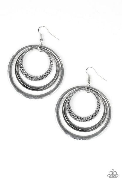 A collision of smooth and textured silver hoops trickle from the ear for a versatile look. Earring attaches to a standard fishhook fitting.