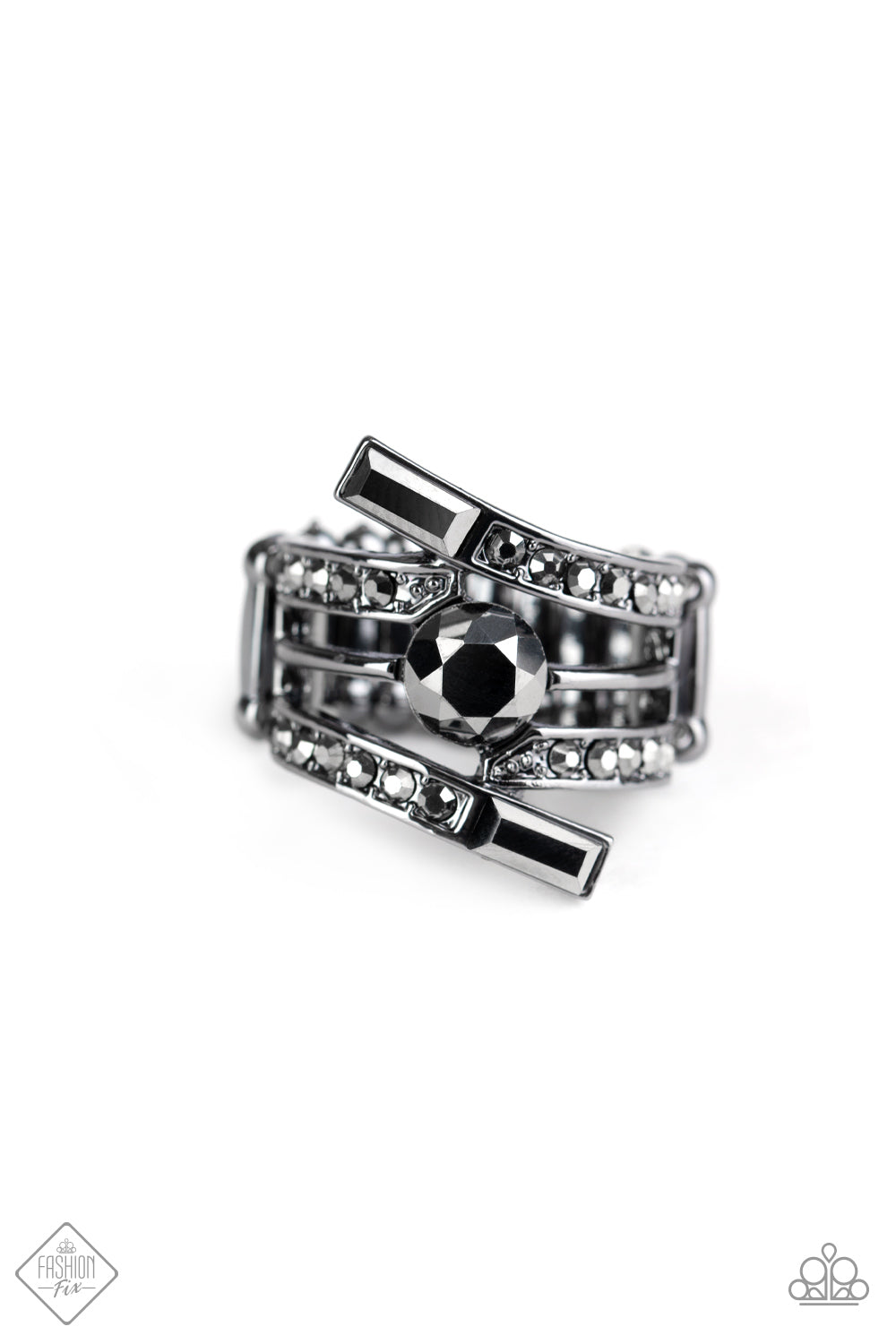 Curved gunmetal bars wrap around the finger, creating a stack of metallic sheen. A hematite rhinestone sits at the center of the design, while smaller pieces of hematite are sprinkled along the bars to emphasize the sparkle. Features a stretchy band for a flexible fit.