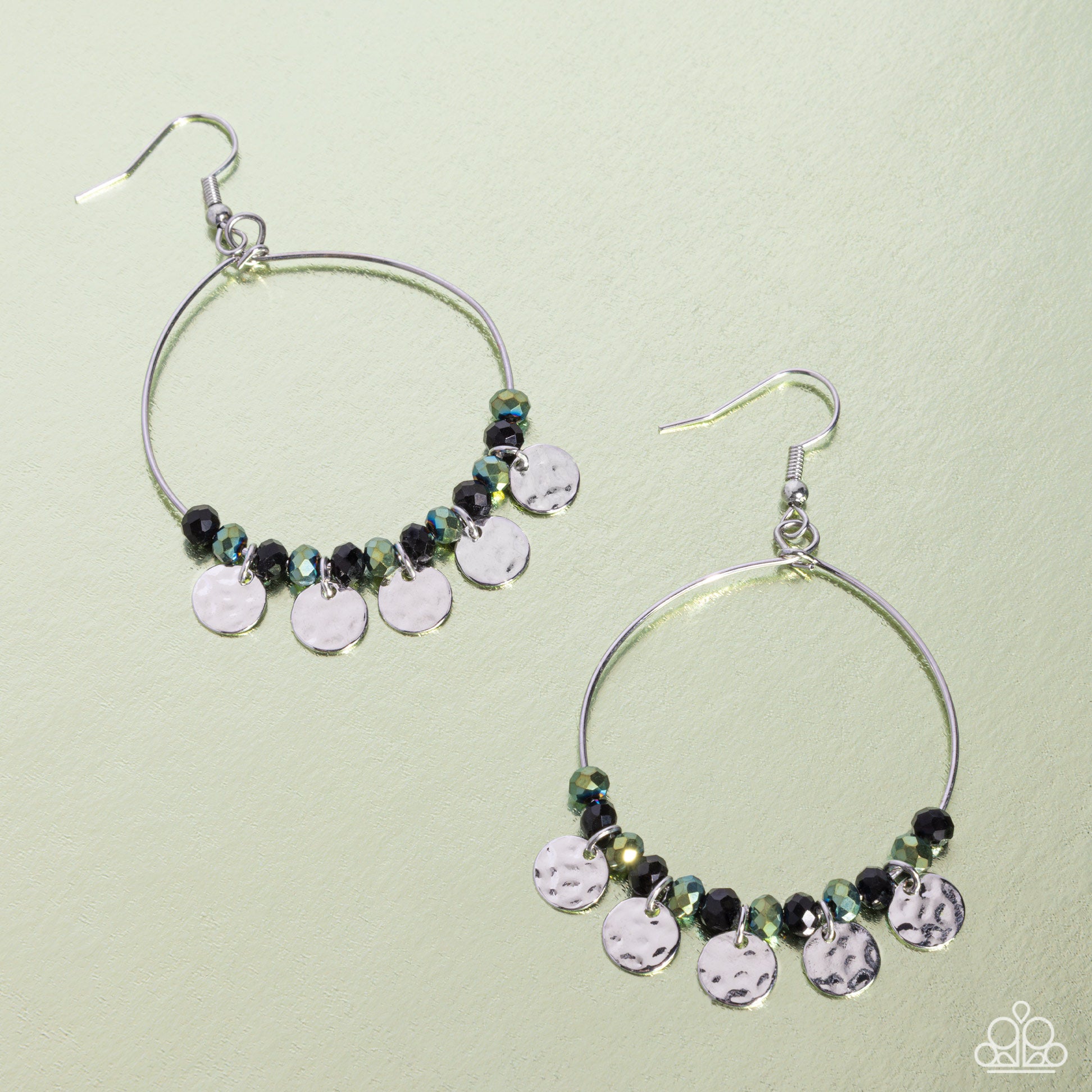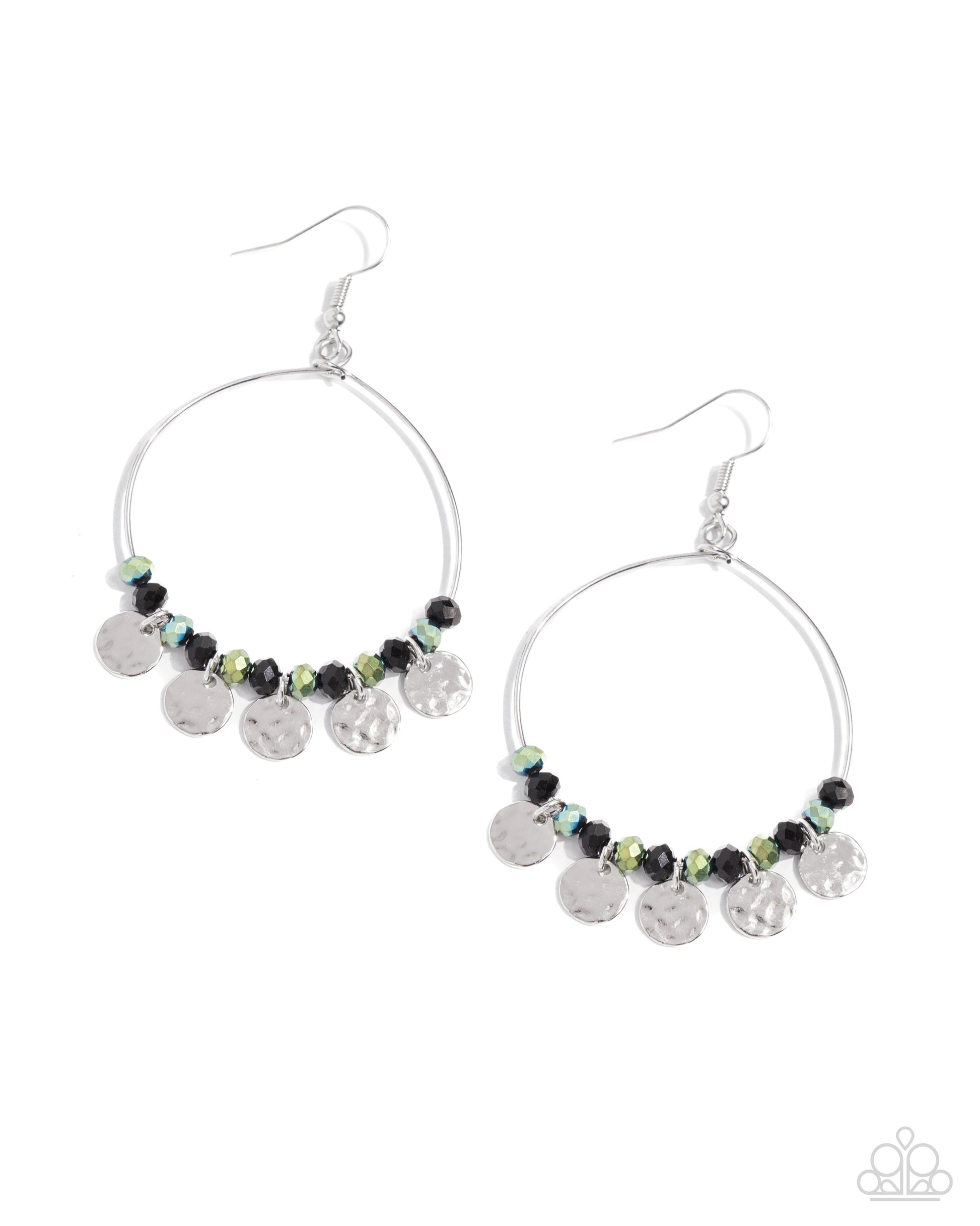 Infused with hammered silver discs, black and UV shimmery beads glide along a wire silver hoop for an ethereal pop of color. Earring attaches to a standard fishhook fitting.