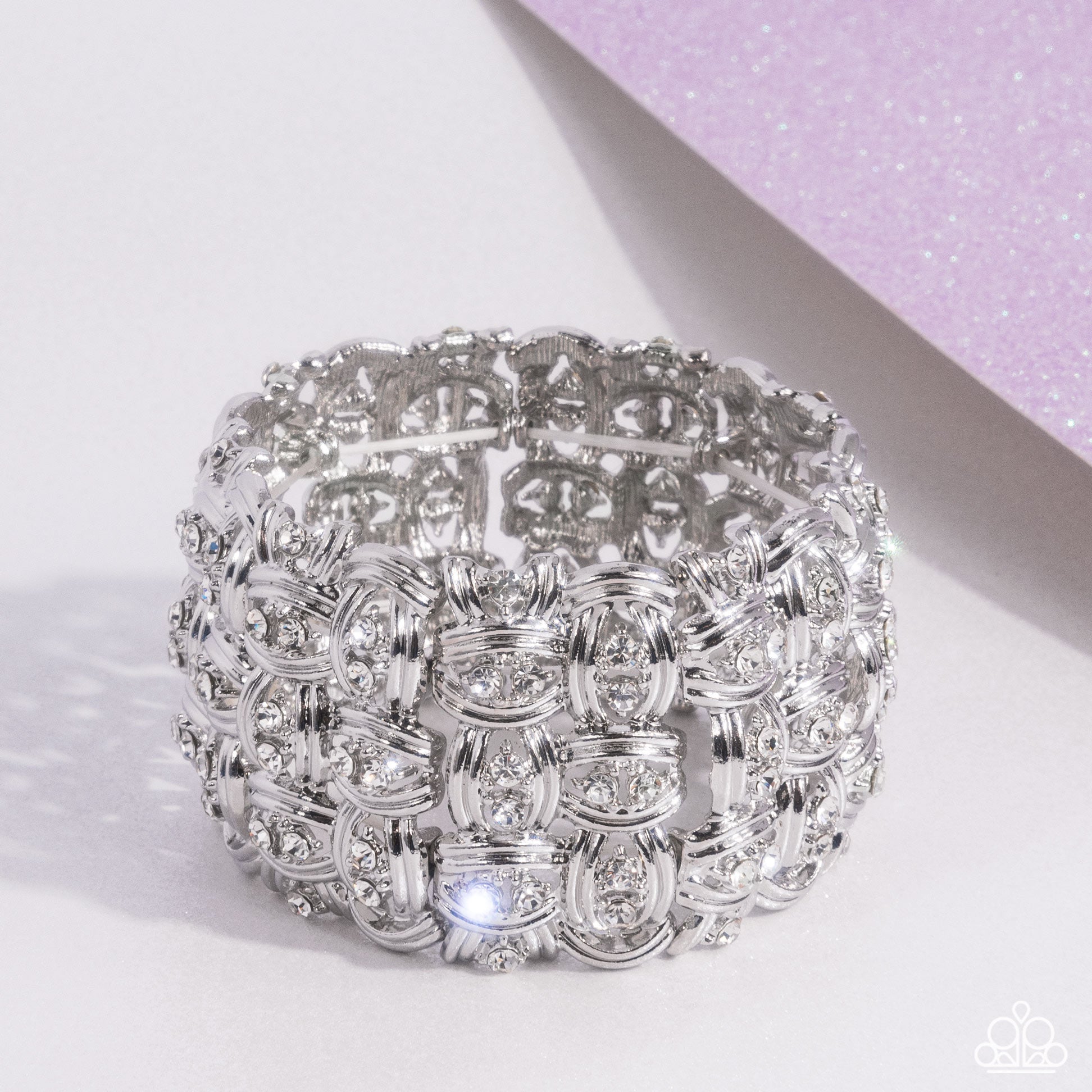 Featuring subtle texture, a collection of high-sheen silver wires are woven and braided along duos of glistening white rhinestones and silver studs that alternate in direction along the wrist on elastic stretchy bands for an iconic, incandescent look.