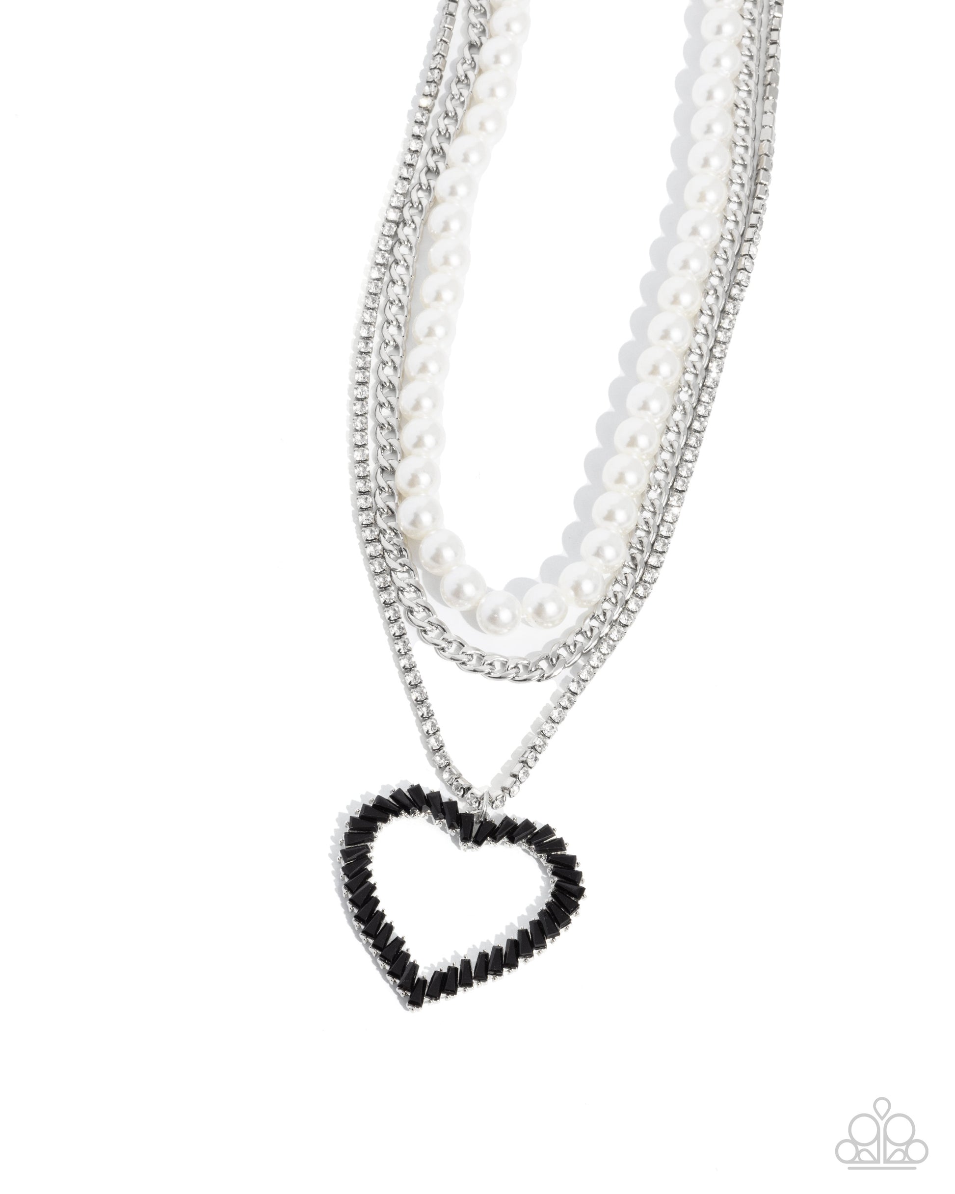 Bold layers of a glistening silver curb chain, white rhinestones pressed in silver square fittings, and glossy white pearls, fall across the chest creating an edgy refined effect. Chiseled black gems in pronged silver fittings twist into an airy heart pendant that glides along the lowermost chain for a romantic finish. Features an adjustable clasp closure.